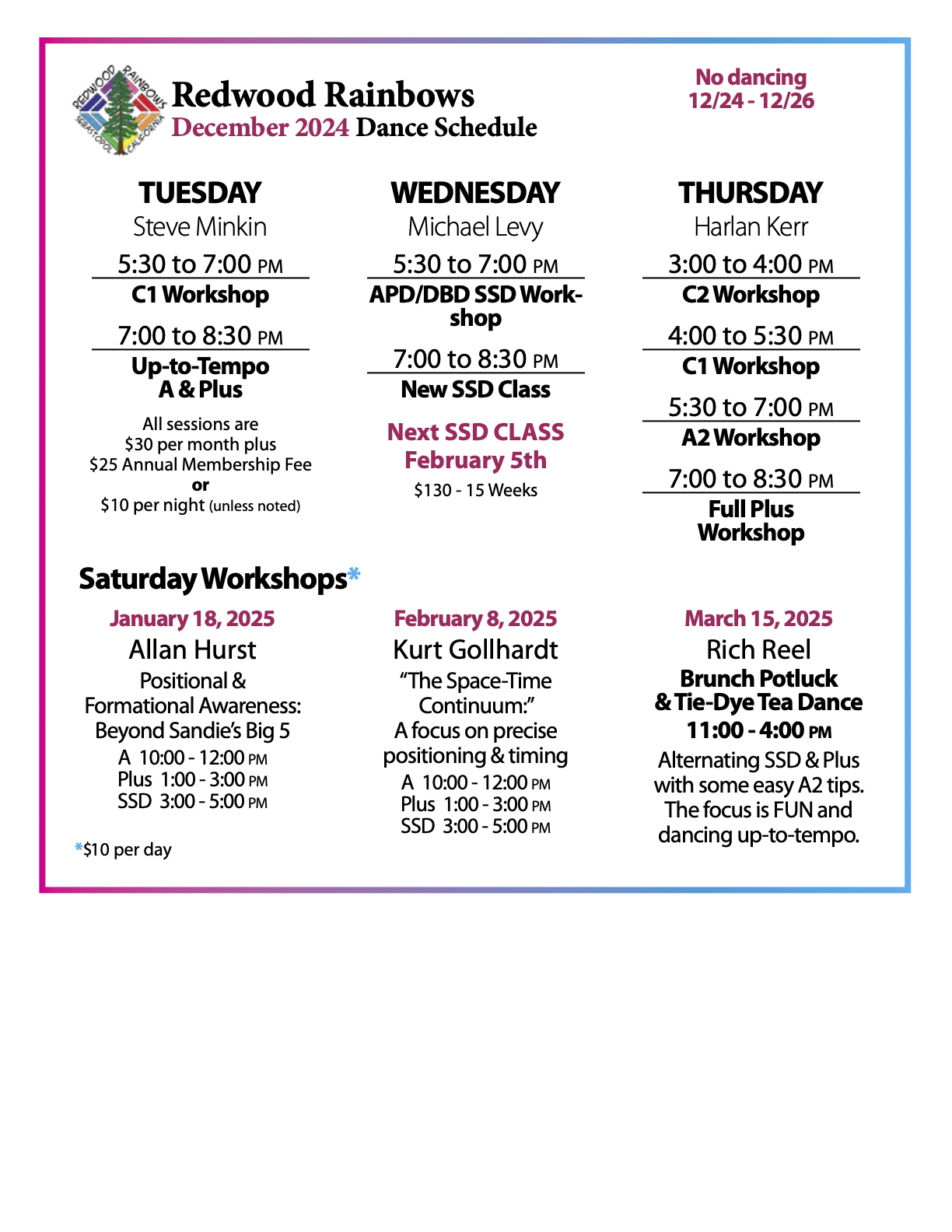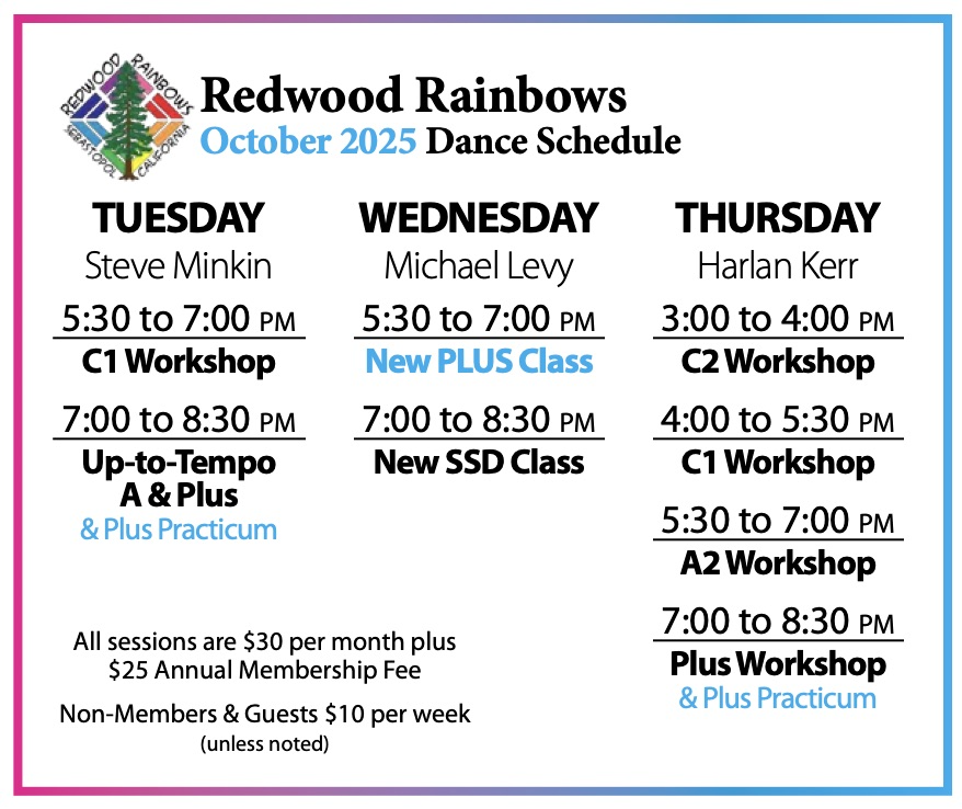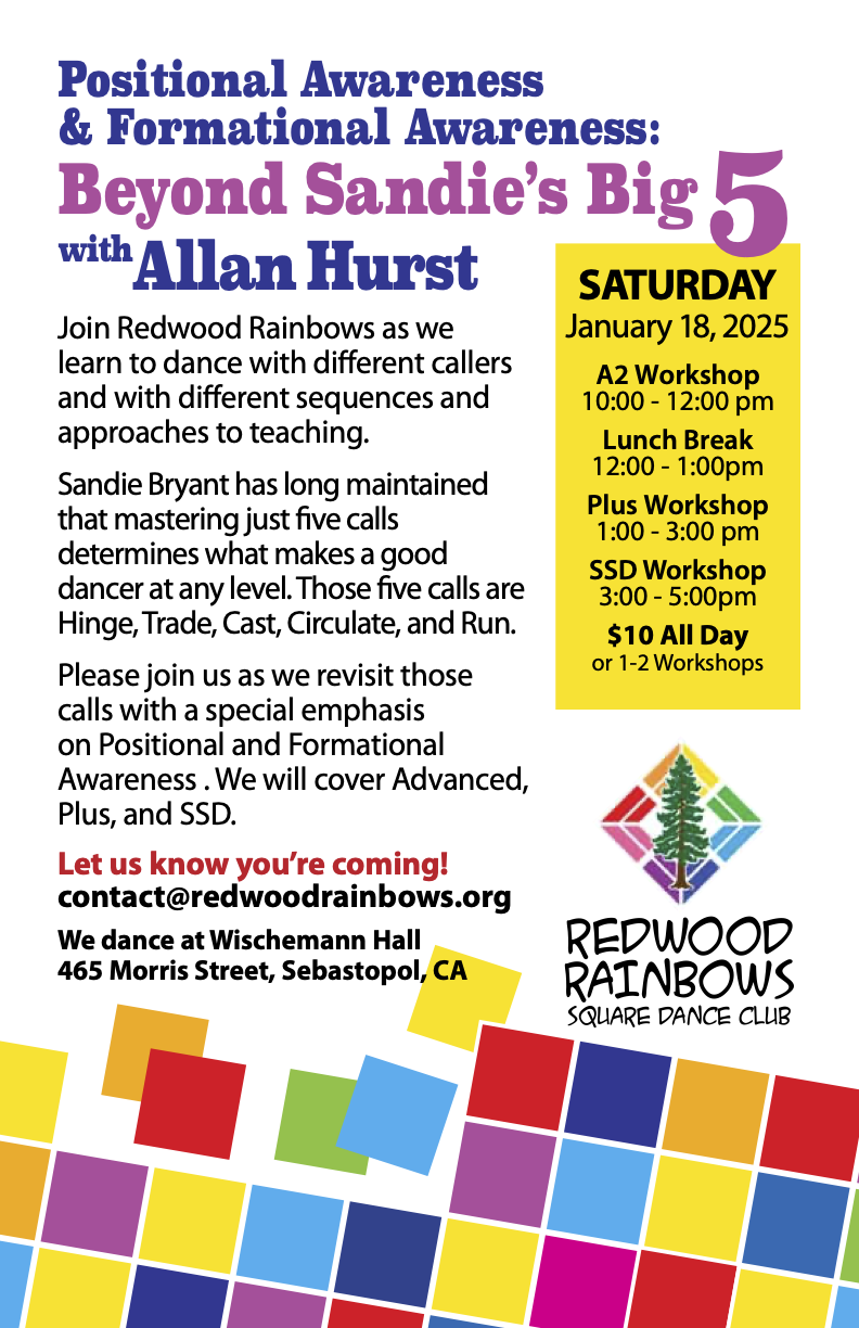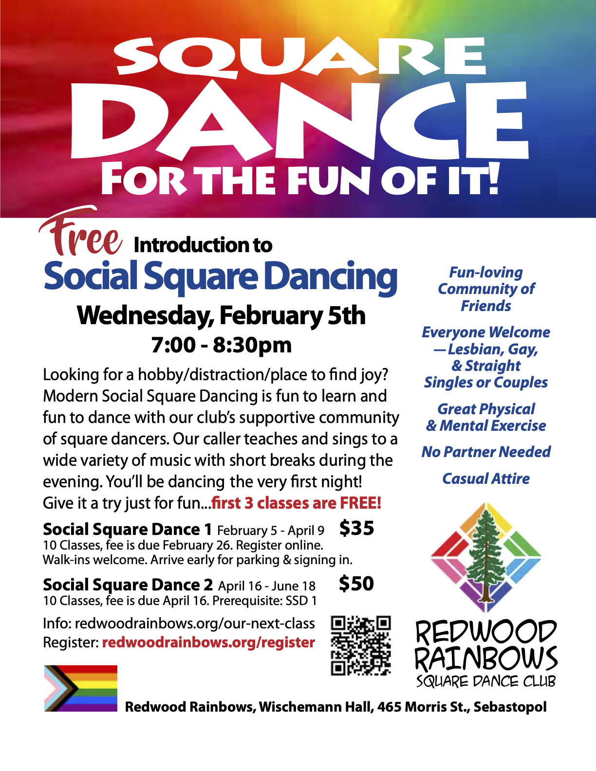 Featured Jan 19, 2024 Our Next Class Jan 19, 2024 Our next Social Square Dance class begins with a free class on Wednesday, February 5, 2025. Read More → Jan 19, 2024 Apr 25, 2022 Redwood Rainbows at the 2022 Sebastopol Apple Blossom Parade Apr 25, 2022 Photos from the parade on Saturday, April 23. Read More → Apr 25, 2022 Nov 12, 2021 We Are Dancing! Nov 12, 2021 Redwood Rainbows has resumed regularly-scheduled dancing! Read More → Nov 12, 2021 Nov 2, 2021 2021 Halloween Dance Nov 2, 2021 2021 Halloween Dance Read More → Nov 2, 2021 Jul 23, 2017 Watch Partners, a Short Documentary Featuring Redwood Rainbows Jul 23, 2017 Watch Partners, a short documentary film by Kate Imbach, Featuring Redwood Rainbows and Times Squares! Read More → Jul 23, 2017 Redwood Rainbows is a fun, friendly, and inclusive Sonoma County square dance club Donate to redwood rainbows